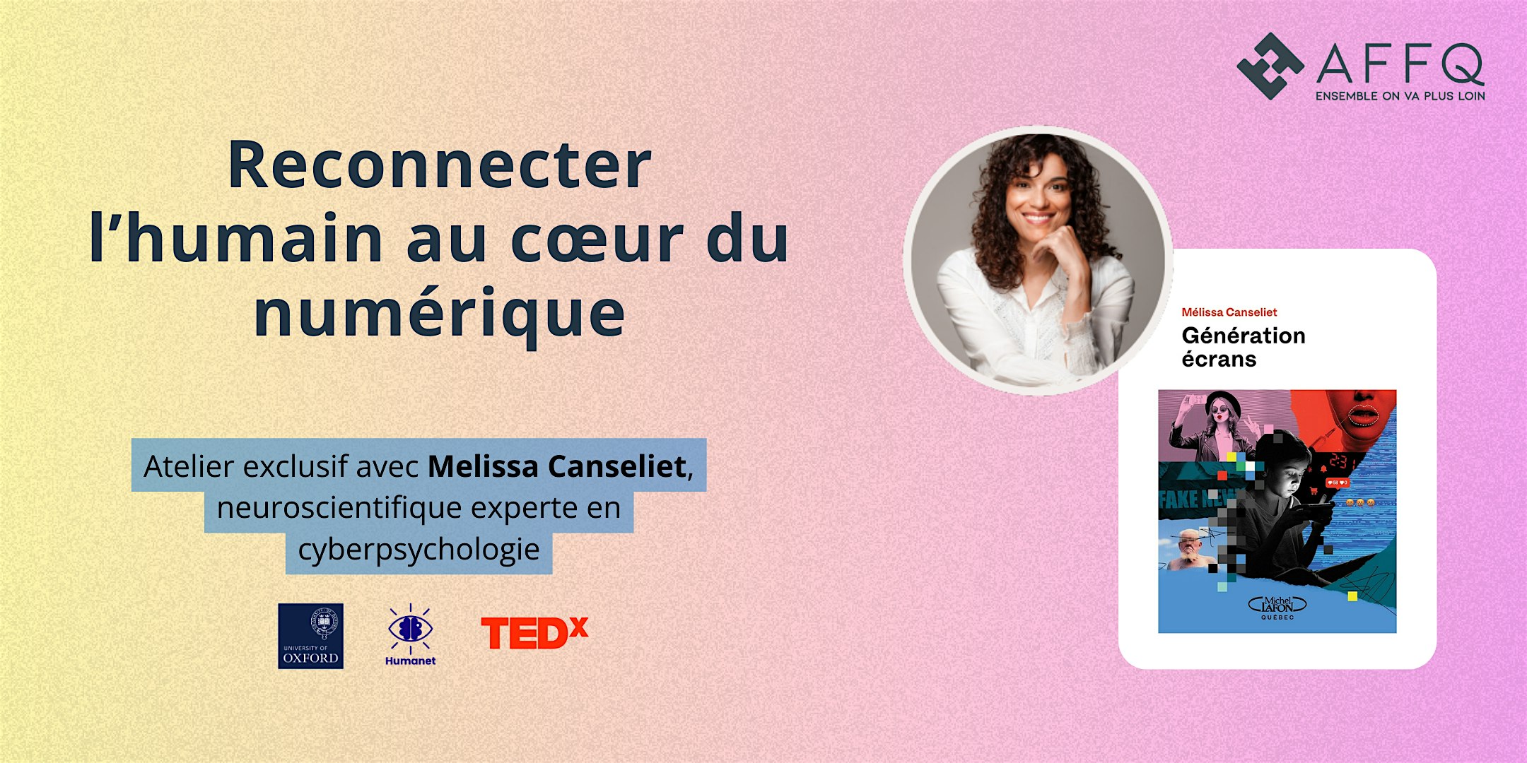 Cet atelier en ligne, animé par Melissa Canseliet explore les liens entre le cerveau, les technologies et nos comportements numériques. Grâce à une approche en conscience neuropsychologique, les participantes comprendront mieux les mécanismes cognitifs à l’œuvre et repartiront avec des leviers concrets pour adopter des pratiques de travail plus saines, sécuritaires et humaines.